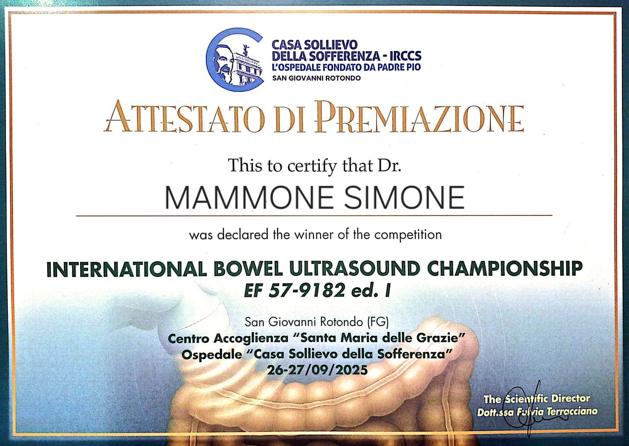 Ho conseguito il Diploma Nazionale di Ecografia Clinica SIUMB. Ho frequentato, superando l’esame finale, il Corso di Ecografia Internistica di Base, della durata di 6 mesi, presso la Scuola di Ecografia di Base dell'Ospedale D.Cotugno di Napoli. Ho partecipato ai corsi avanzati e specialistici in 'Ecografia in epato-gastroenterologia', in 'Ecografia delle Anse intestinali', 'Lyceum SIUMB - Corso avanzato in Ecografia'. Ho partecipato al Corso di Training internazionale in 'Ecografia multiparametrica e gastroenterologica' all'UEG di Copenhagen. Nel 2025 ho vinto la I° Gara Internazionale di Ecografia Intestinale presso l'IRCCS Casa Sollievo della Sofferenza di S.Giovanni Rotondo (FG).